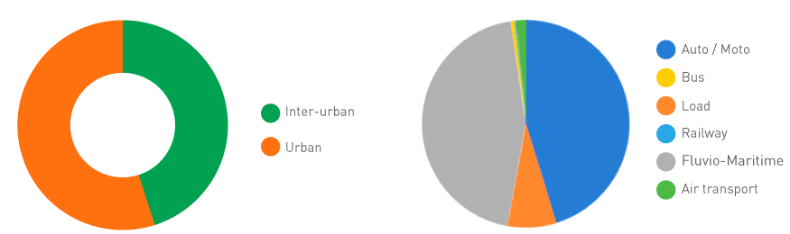 › Regarding the interurban passenger transport, the graph below summarizes the figures obtained through accounting data (rail and air transport) and estimations based on traffic census: the most used mode is the automobile.